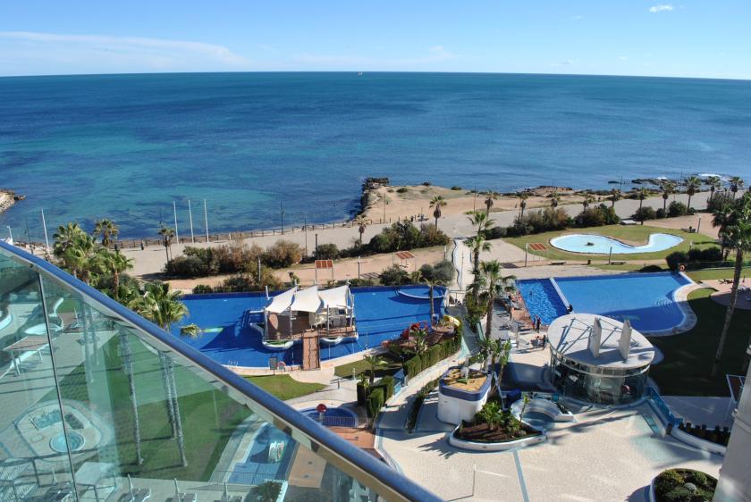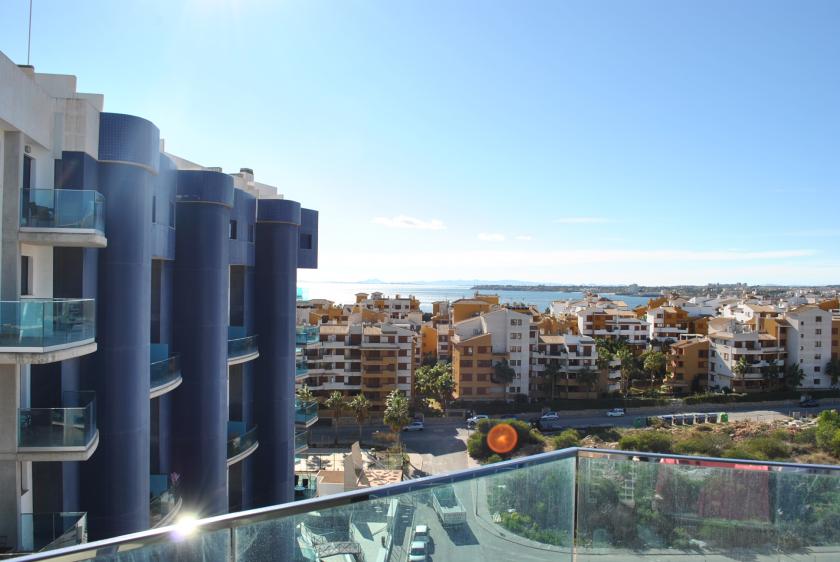 Denne luksuriøse 3-roms leiligheten ligger i 8. etasje og tilbyr to romslige balkonger som vender mot sørøst og sørvest. Herfra kan du nyte fantastisk utsikt over fellesområdene, svømmebassengene, promenaden, naturparken Cala Ferris og til og med havnen og byen Torrevieja.